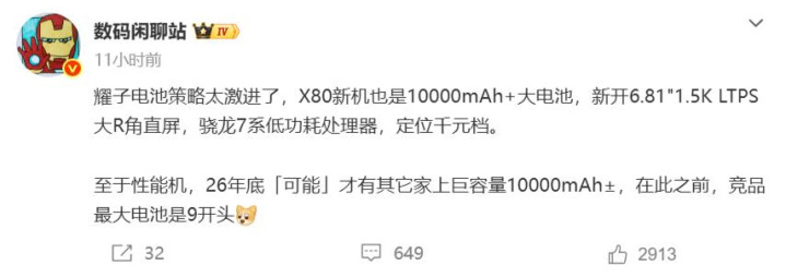 今年说到大电池手机,必不可绕开荣耀,目前为止荣耀有三款万级容量的大电池手机,接下来的千元机也会用上10000mAh容量,据博主数码闲聊站透露,荣耀x80新机也是10000mAh+的大电池,续航上值得期待。